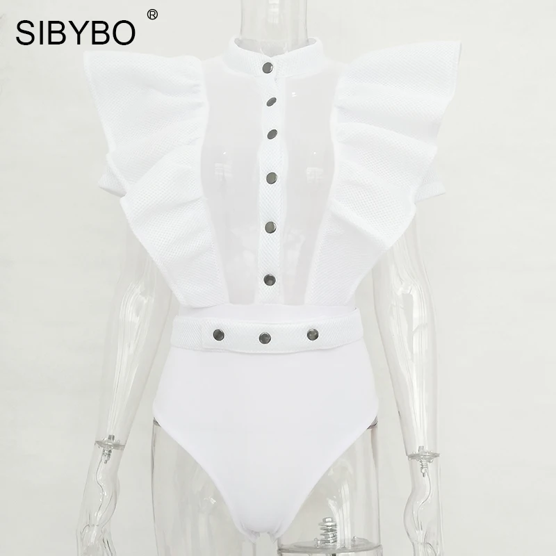 Nazwa:Sibybo Czarny Ruffles Body Kobiety 2018 Lato Hollow Out Combinaison Femme Pajacyki Sexy Krótki Mesh Bodycon Body